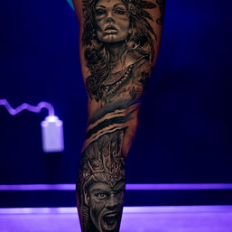 My artistic interests cover a wide range of mediums and styles, which have evolved over different periods of my life. I like to draw people's attention and emphasize their perspective by introducing vibrant and colorful objects to places where they don't belong, with the intention of catching the eye. I have worked with a variety of materials and scales, but my favorite canvases are digital media and skin (tattoos). During my first BA Major, I gained a lot of knowledge about realism pencil and charcoal drawing. Although I don't consider myself a strong realism drawer, the European continent, where the renaissance and classical drawing originated, has left a lasting impression on me. Currently, I focus mainly on small-scale graphics, which make up 80% of my work. I intend to continue focusing on this area and building upon it. Over the years, I've experimented with many different mediums, ranging from 3D work for my degree projects to sculptures made from metal and foam for the Rose Parade. I've also worked on digital designs for posters, cards, and commercial media, as well as paintings made with acrylic and spray paint. Recently, I've been exploring skin and digital media. I am inclined towards the gore, and the grotesque I always found it fascinating as it makes people stare. Devil is in the detail so I do tend to pay as much attention as I mentally can to my fine work. My compositions usually relate to whatever is popular, I often observe the work of other artists in the tattoo world to whom I may relate, in order to develop ideas for my compositions and generate a final product. Specifically in my field of work which is tattoos, I get asked to create original art every week and I have found that to be very challenging but rewarding. That volume tremendously helps the artist to undertake more projects with believe that one can execute them and present them. My current favorite medium is the human skin. My main focus is on a realistic grey work with splashes of red around it (the style is more famously known as “Trash Polka”), It’s a clash of realities. Another style I do enjoy is the “Pencil Sketch” (a way of tattooing where the lines are rough and look like a sketch). When I’m not making tattoos, I do enjoy designing them which sometimes turns into graphic art itself, I use mainly Procreate or Sketchbook for that purpose. I think as an artist my work and my client’s responses have determined me to be a very detail-oriented tattoo artist. This is the field that has brought me the most rewarding development into fine art. I do feel the need to keep pushing the boundaries in order to achieve another step into my detail. Regardless of the medium that I use I always like to attract the interest with flashier and bolder imagery. I will continue to experiment into that topic in order to achieve as much of that effect into my spectators.